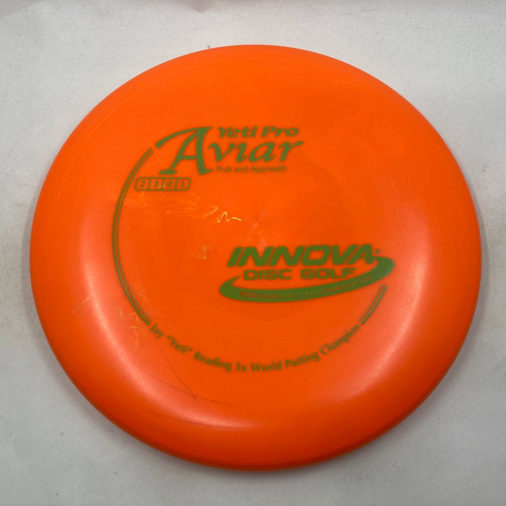The unique slightly concave top of the Yeti allows for a lower profile and a straighter flight than our other big bead models. The Yeti Pro Aviar is a straight flying putter that works well on the course too. Innova developed the Yeti in a firm, grippy blend of R-Pro plastic that feels great in any weather.